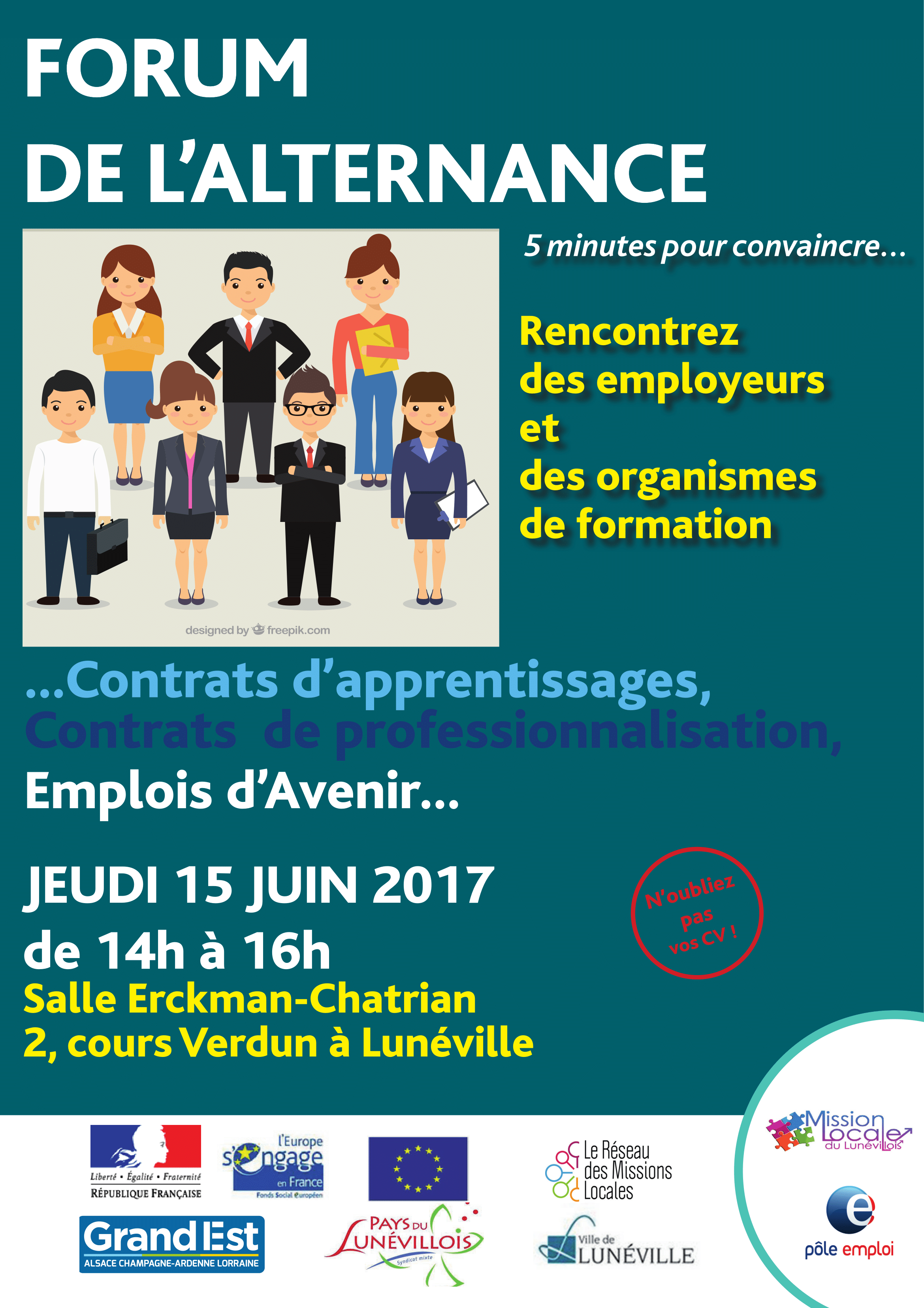 8 juin 2017 La Mission Locale du Lunévillois et Pôle Emploi de Lunéville co-organisent un FORUM DE L’ALTERNANCE – 5 minutes pour convaincre :